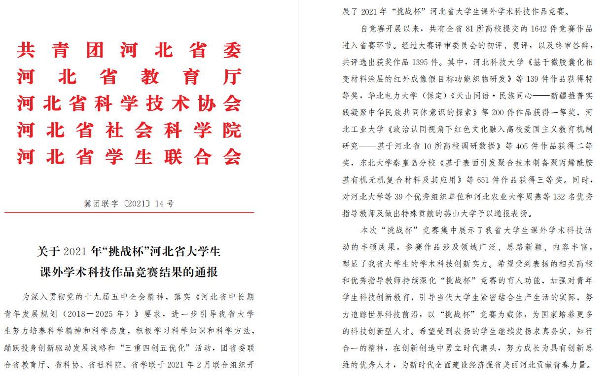 关于2021年度挑战杯河北省大学生课外科技作品竞赛