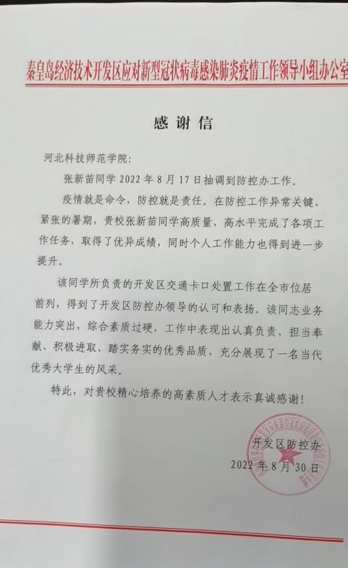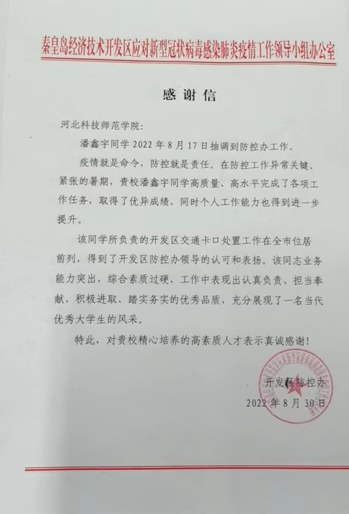 2022年9月16日,秦皇岛市疫情防控办领导刘汶隆和于俊国莅临必赢官网,对暑期疫情志愿者工作表示感谢,并为志愿者颁发表扬信。必赢国际437官网党委书记郝东接待了防控办来宾并进行洽谈。防控办表示,面对严峻的疫情防控形势,必赢国际437官网积极响应国家疫情防控号召,在暑期组织学生参与本市疫情防控工作。疫情就是命令,防控就是责任,在防控工作异常关键、紧张的暑期,潘鑫宇和张新苗两位志愿者所负责的开发区交通卡口处置工作在全市位居前列,得到了开发区防控办领导的认可和表扬。高质量、高水平完成了各项工作任务,他们工作中表现出认真负责、担当奉献、积极进取、踏实务实的优秀品质,充分展现了当代优秀大学生的风采。