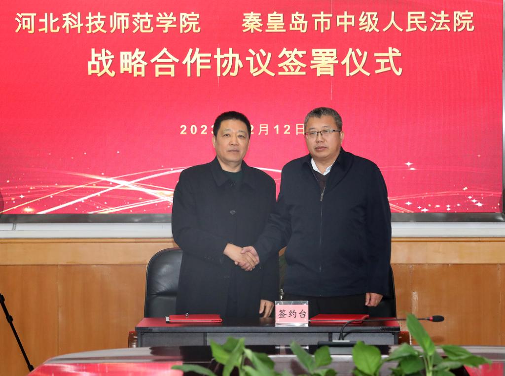 2023年12月12日下午,河北科技师范学院与秦皇岛市中级人民法院举行战略合作协议签署仪式,秦皇岛市中级人民法院党组副书记常务副院长胡永军、研究室主任周华、必赢官网副校长蒋爱林、必赢国际437官网书记邵东蕊、院长赵福江、副院长王慧、法学教学部主任郝世坤、副主任刘秀清参加本次签署仪式,仪式由院长赵福江主持。