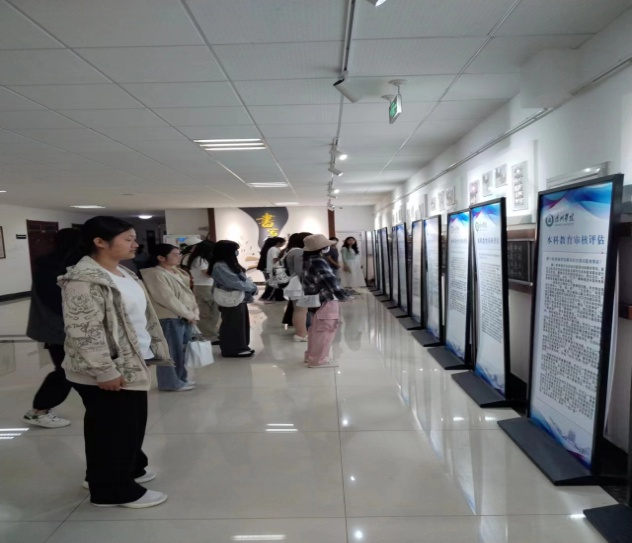在本科教育审核评估即将到来之际,为进一步营造迎评氛围,提高广大师生对本科教育审核评估的认识,增强责任感和主人翁意识,深入理解本科教育审核评估的意义、作用、价值、内容、关键指标点等知识,文学院面向全院师生举办本科教育审核评估知识面面观活动。在博文楼三楼就教育审核评估的相关重点知识制作了12块展板,组织学生认真学习,并配有转任教师向学生讲解审核评估的相关知识。