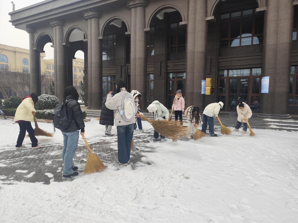 瑞雪兆丰年,今天鲁北大地迎来了入冬以来第一场大雪。12月11日清晨,大地已经银装素裹,皑皑白雪铺满了校园,装扮出了一处处的新奇雪景,但也给大家出行带来些不便。文学与新闻传播学院学生党员、入党积极分子和学生会同学,一个个喜气洋洋,干劲十足地纷纷投入到扫雪行列中来,在博文楼前后左右,男生用铁锨把雪铲松动,女同学用扫帚清出道路……,很快一条蜿蜒的雪中安全小径呈现在大家面前。热火朝天的扫雪结束后,同学们堆起了雪人,打了几下雪仗,深入体会了一下北国雪景的美妙。