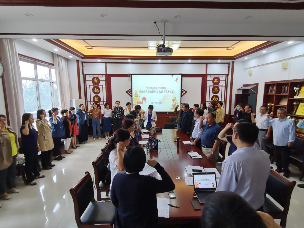 为进一步推进师德师风建设,增强教师对教育事业责任感和使命感,9月28日下午,文学与新闻传播学院开展师德师风教育培训及承诺书签署仪式,全体教师参加了本次学习教育活动。