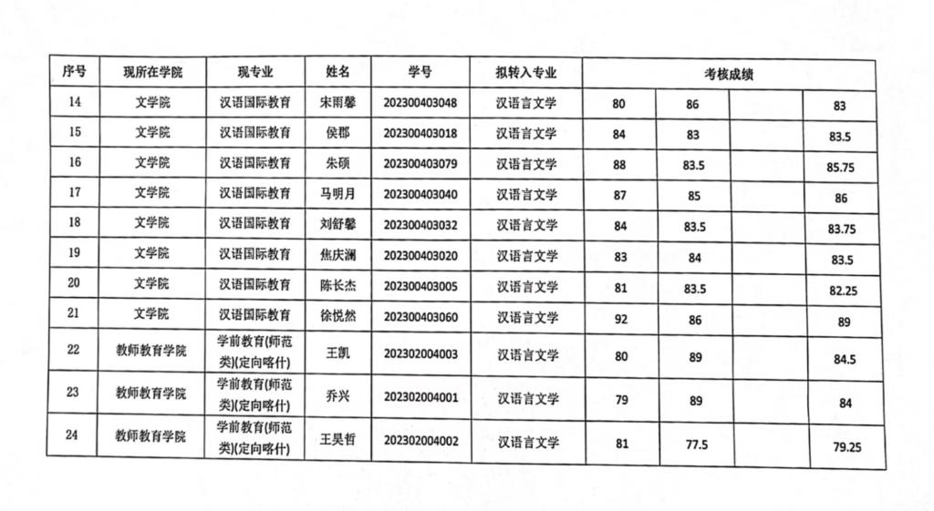 2023-2024-2学期申请转专业学生考核成绩,经beat365在线唯一官网转专业工作领导小组审核后予以公示,公示时间自2024年7月11日至7月13日,请参加转专业考核的同学及时查看附件。公示期间如有异议,请向文学院转专业工作领导小组提交书面申请(签署真实姓名和本人联系电话),并提供相关材料。