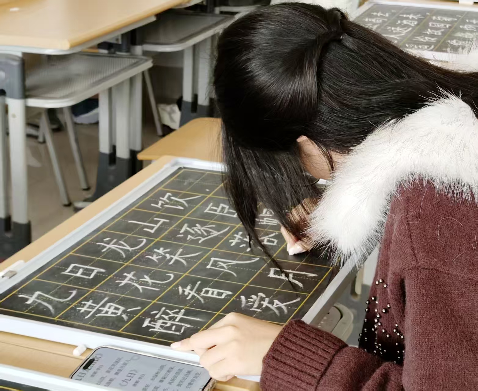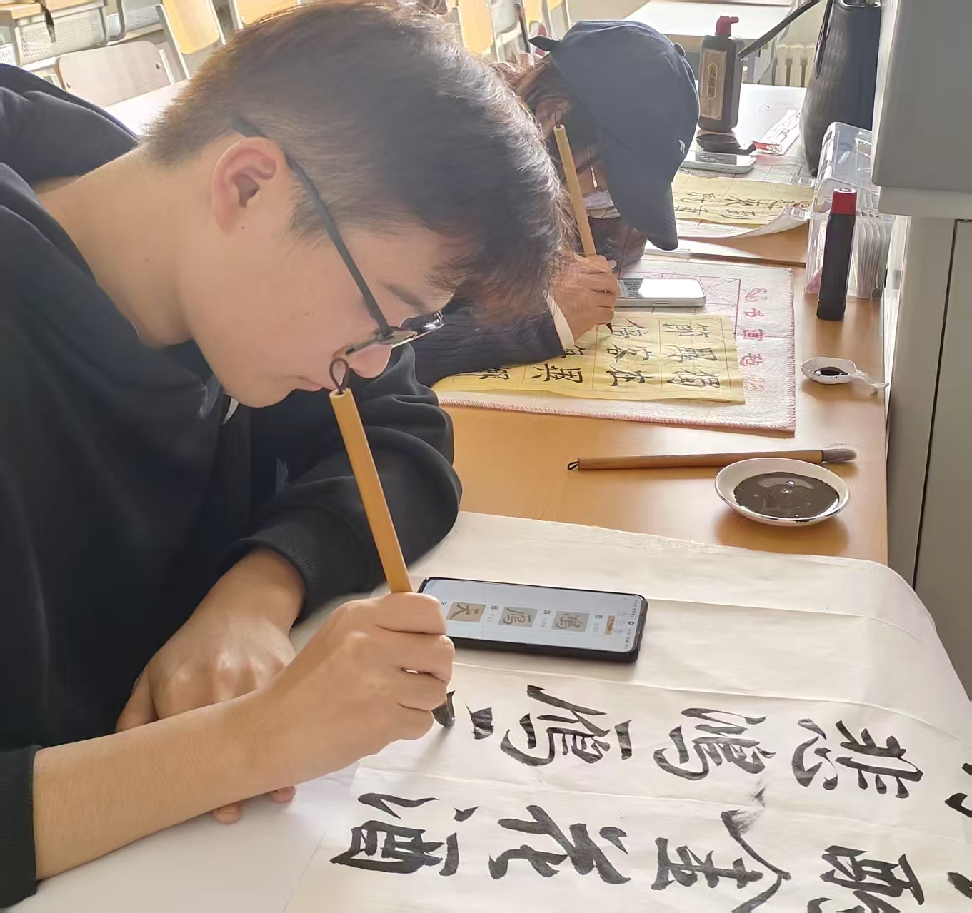 “独在异乡为异客,每逢佳节倍思亲”。同学们以笔墨为媒,围绕重阳经典诗词、敬老寄语等内容进行书写,传递节日温情与文化内涵。纸页间,不同书体各具风骨,每一笔墨痕都承载着同学们对传统文化的理解与共鸣。书法艺术与重阳意蕴相融合,展现出传统节日在当代校园中的生动诠释。