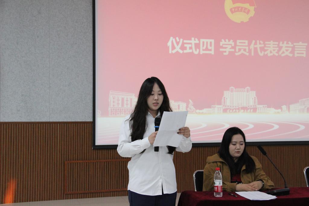 学生代表傅思萌发言,她表示青年学子一定会认真学习贯彻党的二十大精神和二十届三中全会精神,用马克思主义中国化最新理论成果武装自己的头脑,积极参与实践锻炼,在实践中不断磨砺自己。