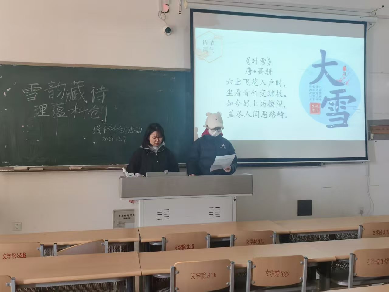 为推动传统文化与科技创新深度融合,丰富学生校园文化生活,激发文理交叉创新思维,12月7日,beat365在线唯一官网在博文楼317教室举办“雪韵藏诗,理蕴科创”线下科创活动,活动以大雪节气为独特契机,以古典诗词为文化纽带,创新性地搭建起文理学科跨界交流的平台。