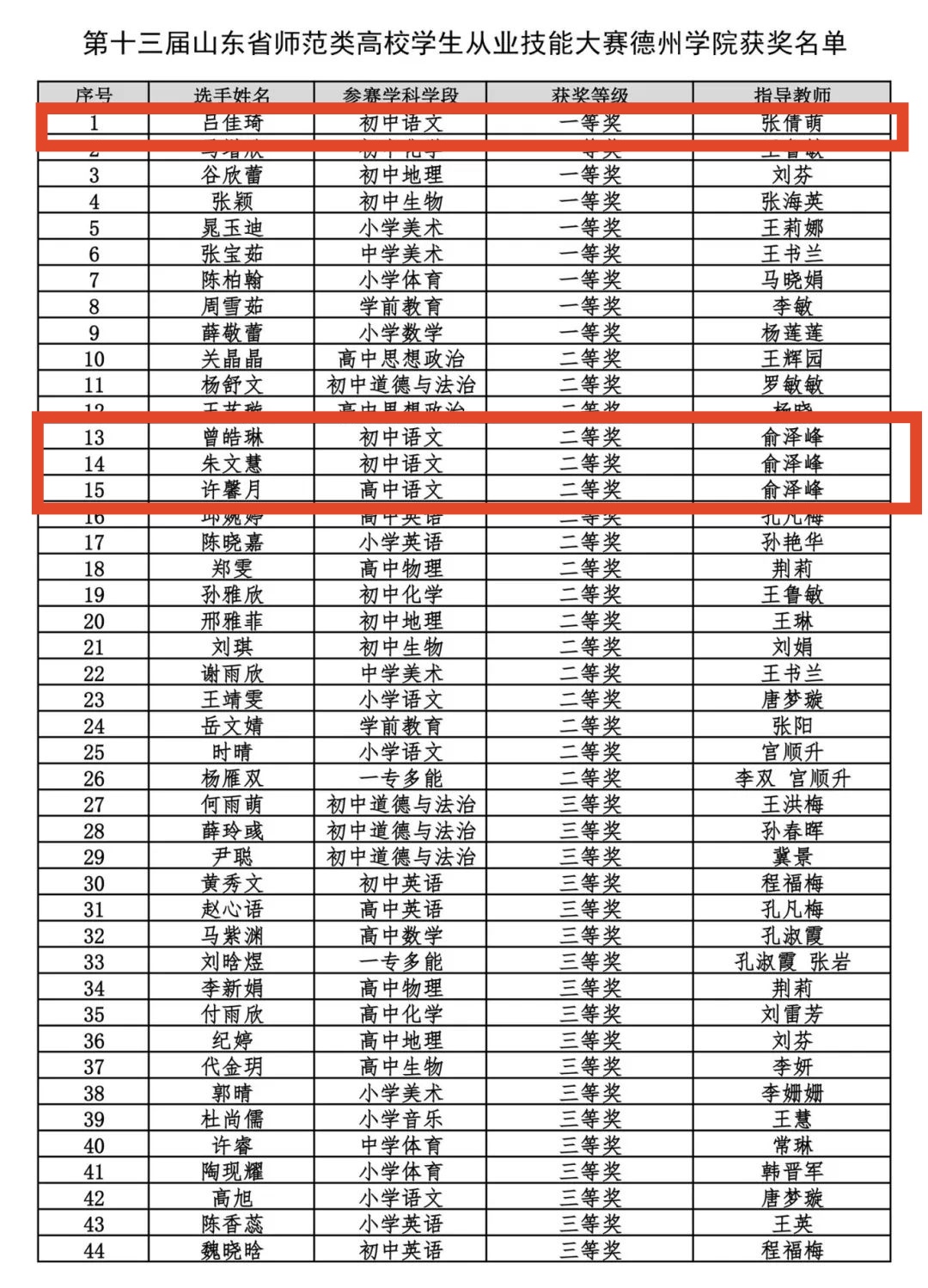 beat365官网选手凭借扎实的专业功底和教学智慧,展现了出色的课堂驾驭能力。其中,初中语文组吕佳琦以扎实功底和出色表现荣获一等奖第一名,朱文慧、曾皓琳荣获二等奖,高中语文组许馨月荣获二等奖。选手们从容自信的教态、将知识讲解与素养培育巧妙融合的教学设计,充分彰显了学院学生的综合能力。