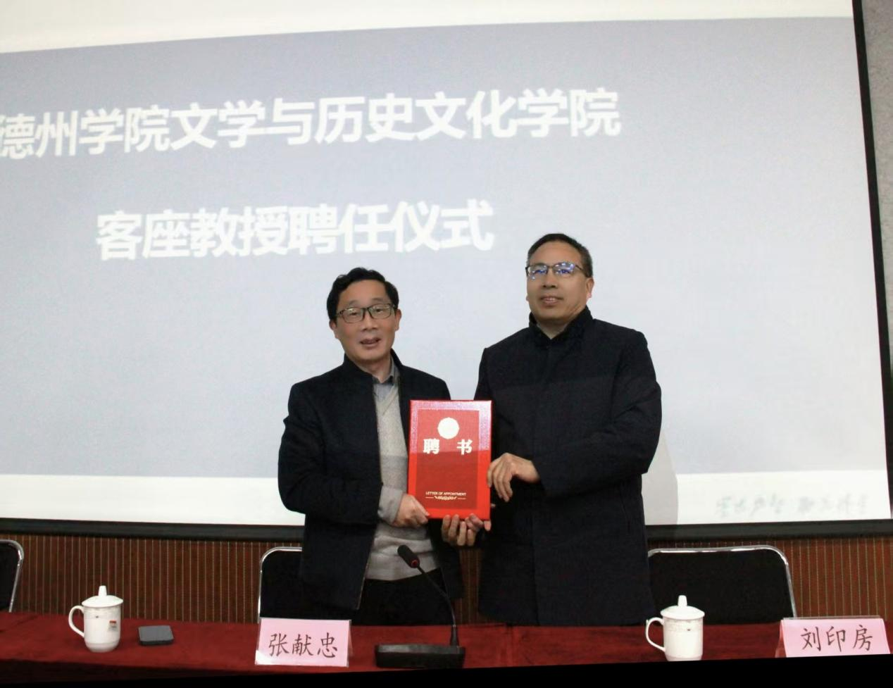 学院在博文楼举行客座教授聘任仪式,校党委委员、副校长刘印房教授为张献忠颁发客座教授聘书,学院党委副书记鞠晶晶、历史学系主任乔毅等出席活动。