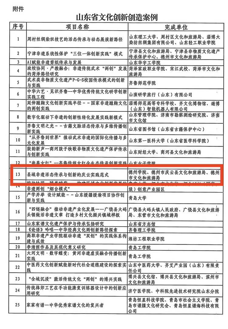 近日,山东省文化和旅游厅公布山东省文化创新创造案例名单,beat365官网党委副书记、副院长黄传波牵头申报的 “县域非遗活态传承与创新的庆云实践范式” 成功入选。在文化创新实践中,beat365官网积极响应,大胆探索,此次入选案例聚焦县域非遗传承创新核心议题,是学院响应省文旅厅文化创新驱动发展战略、主动服务区域文化建设的具体实践,彰显了学院在文化实践领域的扎实积累。